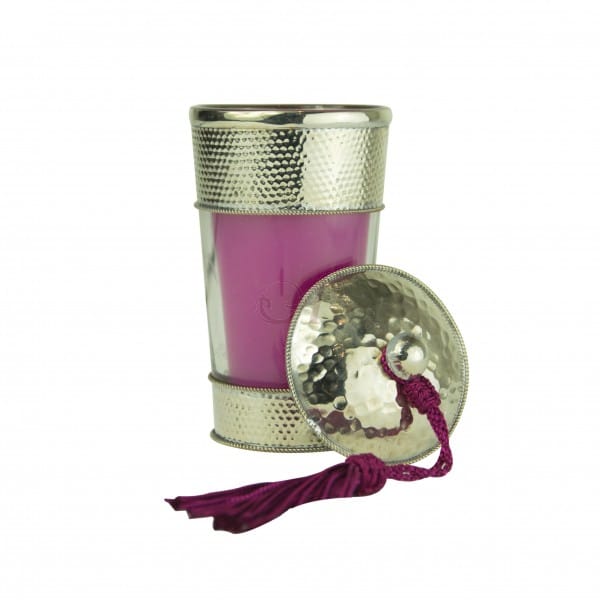 Bougie orientale fait main par des artisans marocains. Parfumées et colorées, ces bougies sont contenues dans un récipient en verre cerclé de métal martelé et recouvert d’un chapeau en maillechort accompagné d’un joli pompon en soie végétale. Taille : 10,5 cm de hauteur et 6,5 cm de diamètre. Poids : 220 g.